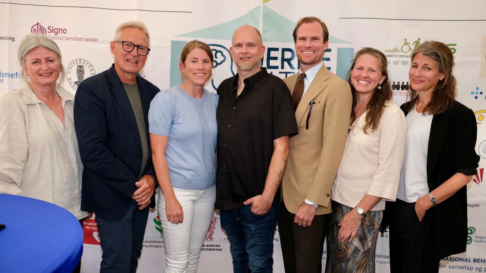 OVERBEHANDLING: Disse samlet seg til en panelsamtale om ADHD hos barn og unge under Arendalsuka 2025. Fra venstre: Line Lund, Hans Petter Fundingsrud, Henriette Sandven, Tom Wormfield Markeng, Fredrik Frogner Juul, Hege Kristiansen og Charlotte Lunde. Foto: Hjernerådet.